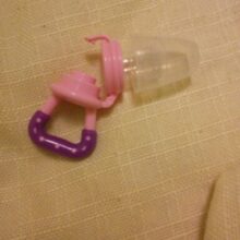 Got this for my 5 month old who just started trying food and has been teething since 3 months with no progress. I used the smallest one with frozen blueberries and she loved it. She can hold it herself with little help and I love that it can be cleaned very easily. We had a mesh feeder and tossed it because it is so hard to clean really well and just gets floppy and gross when the food thaws. This is a much better alternative and great price. My only concern is that the nipple piece can be removed too easily but hasn’t caused any issues yet.