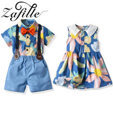 ZAFILLE Sister And Brother Clothes Flower Pinted Matching Outfits Dress Sweet Kids Newborn Girls Dresses Gentleman Baby Boys Set