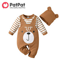 PatPat 2pcs Baby Boy Clothes Girl New Born Boy Overalls Jumpsuit Romper Infant Newborn Bear Spliced Striped Long-sleeve Hat Set